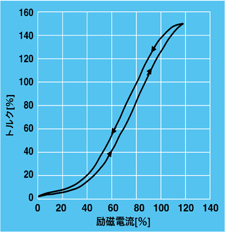 ヒステリシス形の電流に対する伝達トルクは、右図に示すように広範囲にわたって、ほぼ直線性を示します。