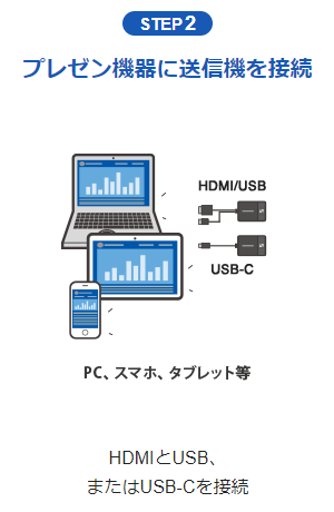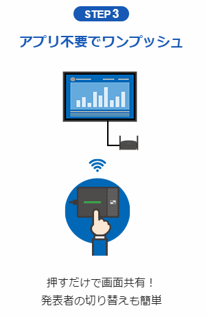 特別なソフトやドライバーを設定する必要はありません、ボタンひと押しのプラグアンドプレイでワイヤレスプレゼンテーションを実現。