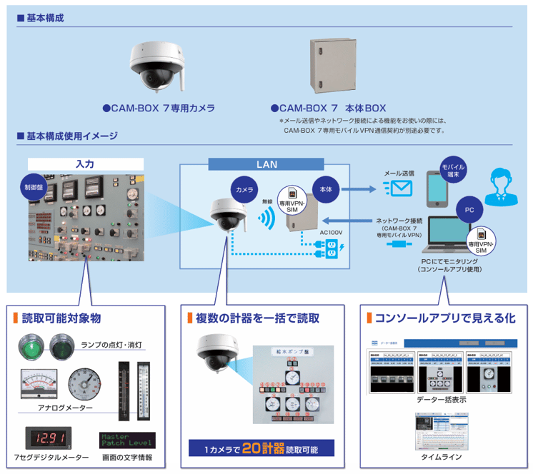 CAM-BOX7のシステムは既設の制御盤はそのままで、 計器の情報を読取データ化し、IoT化による劇的な効率アップとコストダウンを同時に実現します。